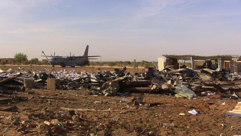 Debris is seen after an attack on UN offices at the airport in Gao