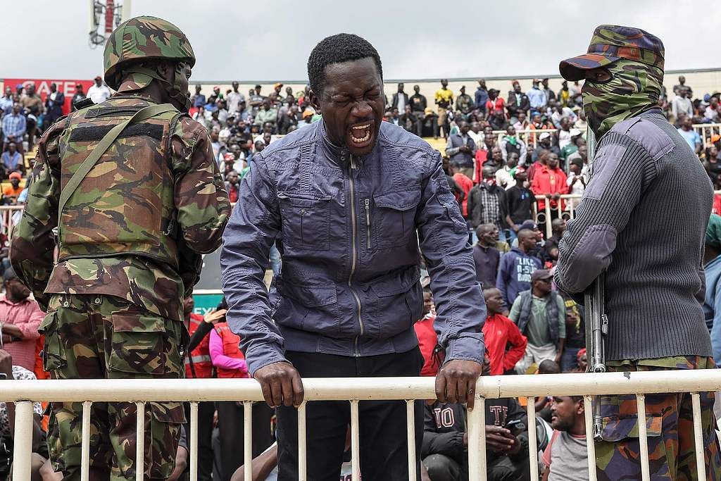 Thousands of mourners, eager to pay their respects, were directed to a single gate opening onto the tartan track, flanked by armed soldiers. The military acted as a barrier, guiding the mourners towards the tent where Odinga’s body lay.
